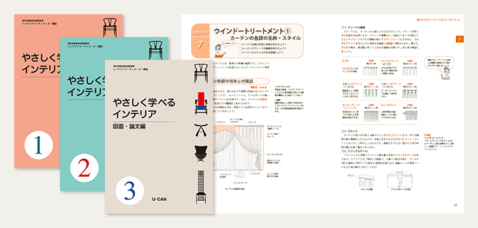 ユーキャンの「インテリアコーディネーター」講座では、過去の試験問題を徹底的に分析し、ポイントを絞って構成されたテキストを使用。二次試験の論文についても合否のポイントをやさしく指導します。さらに、講義映像を併用することで、文字だけではわかりづらい知識も習得でき、試験突破力により磨きをかけられます。