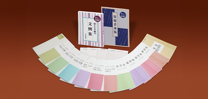 - ガイドブック、お知らせと提出用紙、実用手本集、使える手紙の文例集、字配り用下敷き、練習帳4冊、課題提出用紙集