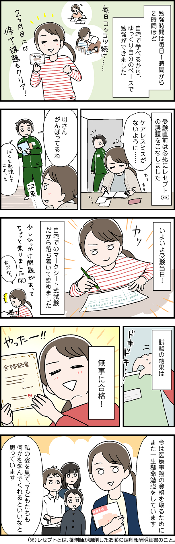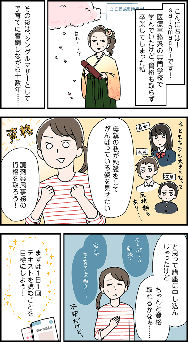 子どもに頑張っている姿を見せるため、家事と子育てとを両立しながら受講を続け、見事合格を手にされたというSatomachiさん。身近な人からの温かいサポートに支えられ、それが大きなエネルギーになったそうです。受講生のリアルな体験談を、ぜひご覧ください。