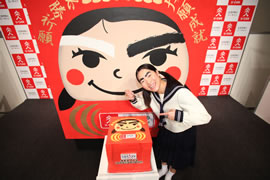 二人で一緒に「四角」と「資格」をかけた「四角い」達磨=「シカク達磨」に「目入れ」ならぬ「眉入れ」を行い、合格を祈願。イモトアヤコは「絶対合格します!」と気合の入った合格宣言を行いました。