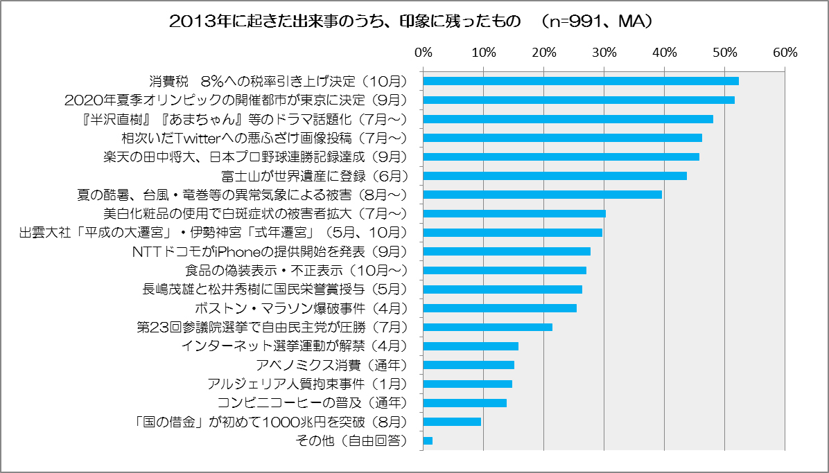 ・2013年に起きた出来事で印象に残ったもの:1位「消費税 8%への税率引き上げ決定」(52.3%)、