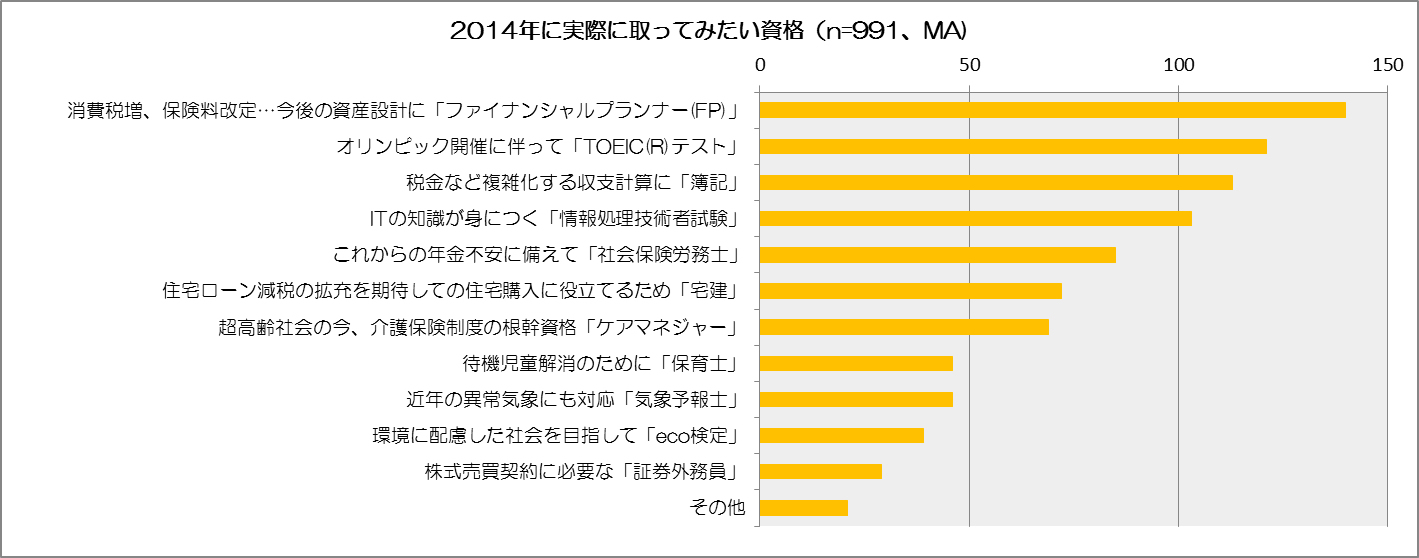 2014年に、実際に取ってみたい資格についても聞いたところ、こちらも1位は「ファイナンシャルプランナー(FP)」で、2位は「TOEIC(R)」、3位は「簿記」、4位「情報処理技術者試験」、5位「社会保険労務士」と続きました。