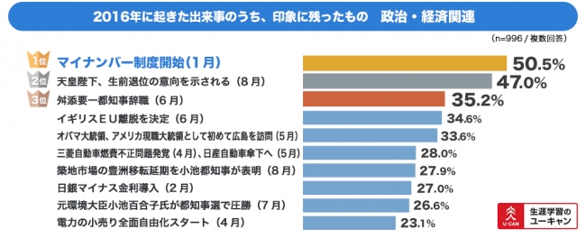 政治・経済関連 1位「マイナンバー制度開始」(50.5%)、2位「天皇陛下、生前退位の意向を示される」(47.0%)