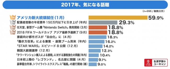 次に、2017年に話題になりそうなことを聞いたところ、過半数の59.9%の方が1月に予定されている「アメリカ新大統領就任」を選び、2位「配偶者控除の年収要件150万円以下に引き上げ」(29.3%)を大きく引き離して1位となりました。11月に行われたアメリカ大統領選挙では、事前の予想に反してトランプ氏が当選したのが記憶に新しいところ。トランプ氏の話題は2017年ますます注目されそうです。