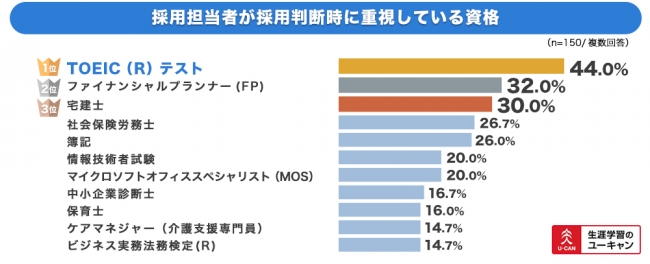 採用担当者に、採用を判断するときに重視している資格を聞いたところ、1位「TOEIC(R)テスト」(44.0%)、2位「ファイナンシャルプランナー(FP)」(32.0%)、3位「宅建士」(30.0%)、4位「社会保険労務士」(26.7%)、5位「簿記」(26.0%)という回答になりました。