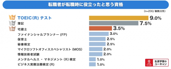 ●今年転職した人が選ぶ、転職で役立った資格1位「TOEIC(R)テスト」(9.0%)、2位「簿記」(7.5%)