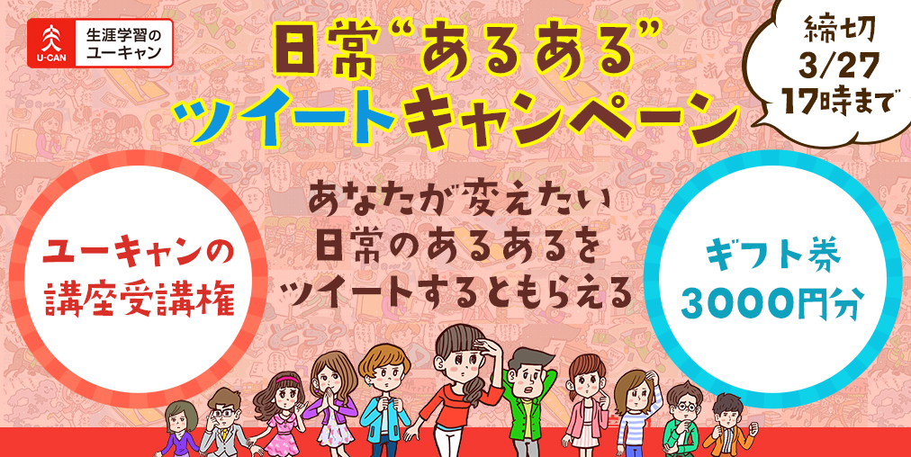 株式会社ユーキャンは、2017年1月27日(金)より「変えたいけど変えられない!日常"あるある"ツイートキャンペーン」を開始いたしました。投票に参加いただいた方の中から抽選で当社の通信講座の受講権や、Amazonギフト券3,000円をプレゼントいたします。