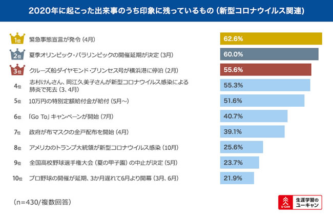 「2020年に起きた出来事のうち、印象に残ったものは何ですか」と質問したところ、新型コロナウイルス関連の出来事では、1位「緊急事態宣言が発令」(62.6%)、2位「夏季オリンピック・パラリンピックの開催延期が決定」(60.0%)、3位「クルーズ船ダイヤモンド・プリンセス号が横浜港に停泊」(55.6%)、4位「志村けんさん、岡江久美子さんが新型コロナウイルス感染による肺炎で死去」(55.3%)、5位「10万円の特別定額給付金が給付」(51.6%)という結果になりました。