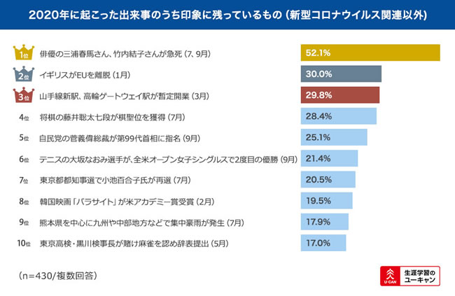 【1】2020年、印象に残った出来事は「緊急事態宣言が発令」「夏季オリンピック・パラリンピックの開催延期」(新型コロナウイルス関連)、「俳優の三浦春馬さん、竹内結子さんが急死」「イギリスがEUを離脱」(新型コロナウイルス関連以外)