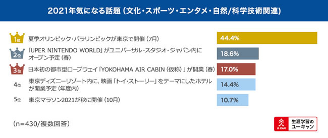 次に、2021年に話題になりそうなことを聞いたところ、文化・スポーツ・エンタメ・自然/科学技術関連では、1位「夏季オリンピック・パラリンピックが東京で開催」(44.4%)、2位「『SUPER NINTENDO WORLD』がユニバーサル・スタジオ・ジャパン内にオープン予定」(18.6%)、3位「日本初の都市型ロープウェイ『YOKOHAMA AIR CABIN(仮称)』が開業」(17.0%)が上位となりました。今年開催予定だったイベントや、オープン予定だった施設に改めて注目が集まっていることが分かりました。