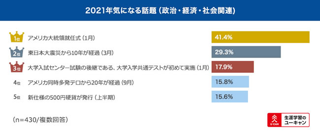 一方、政治・経済・社会関連では1位「アメリカ大統領就任式」(41.4%)、2位「東日本大震災から10年が経過」(29.3%)、3位「大学入試センター試験の後継である、大学入学共通テストが初めて実施」(17.9%)という結果に。2021年は体制や制度の変化はもちろん、東日本大震災から10年、アメリカ同時多発テロから20年の節目の年でもあり、改めて話題になるのではと予想する声が見られました。