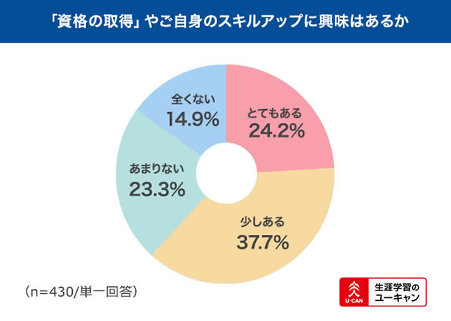 また、毎年調査している「資格の取得や自身のスキルアップについて興味があるか」という質問に対しては、「とてもある」(24.2%)「少しある」(37.7%)と、例年通り6割ほどの方がスキルアップに興味ありという結果になりました。「今後、新たな資格を取得したいか」という問いに対しても、「とても取得したい」(22.3%)「どちらかというと取得したい」(40.0%)と多くの方が資格取得に意欲的であることがわかりました。これまで以上に先が見えない時代だからこそ、資格取得やスキルアップへの関心は今後も続いていくことが予想されます。