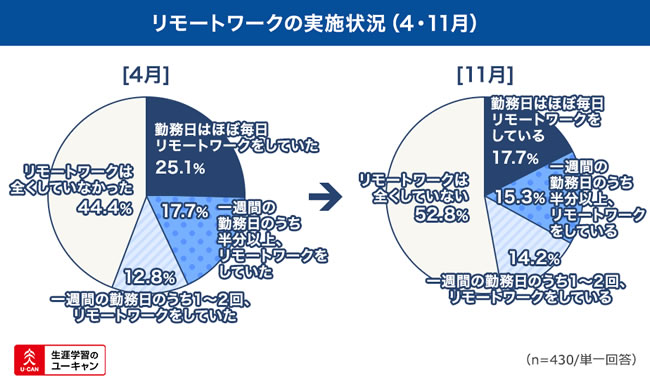 リモートワークの頻度に関して尋ねたところ、2020年4月ごろは、ほぼ毎日リモートワークをしていた方が25.1%、1週間に1日でもリモートワークをしていた方が計55.6%という結果となりました。それに対して、現在(2020年11月)の状況については、毎日リモートワークしていると答えた方は17.7%、1週間に1日でもリモートワークをしている方が計47.2%でした。緊急事態宣言が解除されてからしばらく経ち、一部の方は出社しての業務に戻った様子ですが、未だ半数近くの方はリモートワークを活用して働いていることが分かります。