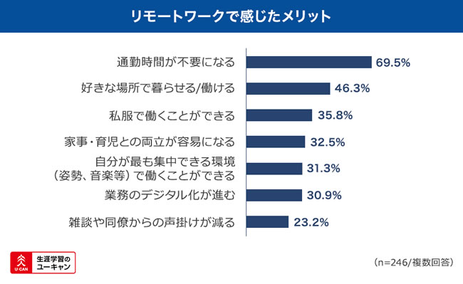 具体的なリモートワークのメリットに関しては、69.5%もの方が「通勤時間が不要になる」ことがメリットだと回答。以下「好きな場所で暮らせる/働ける」(46.3%)、「私服で働くことができる」(35.8%)と続きました。場所や服装等の制限がなくなったことを、多くの人が好意的にとらえていることが分かります。
