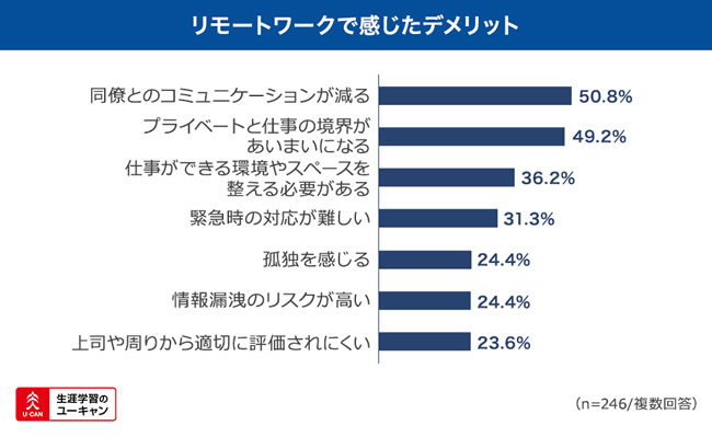 一方のデメリットについては、50.8%の方が「同僚とのコミュニケーションが減る」ことを挙げました。以下「プライベートと仕事の境界があいまいになる」(49.2%)、「仕事ができる環境やスペースを自分で整える必要がある」(36.2%)となり、気楽さはありつつも一部で不自由さを感じている事が分かりました。