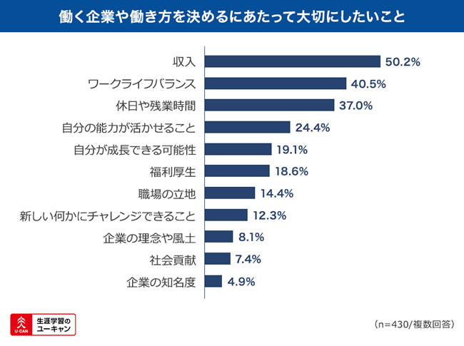 そんな不安を抱える中で、今後働くにあたって重要と捉えられていることは何なのかを明らかにするため、続いて「働く企業や働き方を決めるにあたって大切にしたいことは」という質問を行いました。その結果、1位「収入」(50.2%)、2位「ワークライフバランス」(40.5%)、3位「休日や残業時間」(37.0%)という順位になりました。一方で「職場の立地」については14.4%の回答に留まりました。