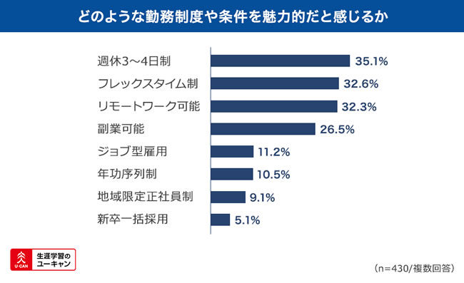制度面に関して「どのような勤務制度や条件を魅力的だと感じますか」と尋ねたところ、「週休3〜4日制」(35.1%)、フレックスタイム制(32.6%)、リモートワーク可能(32.3%)等が上位に上がりました。