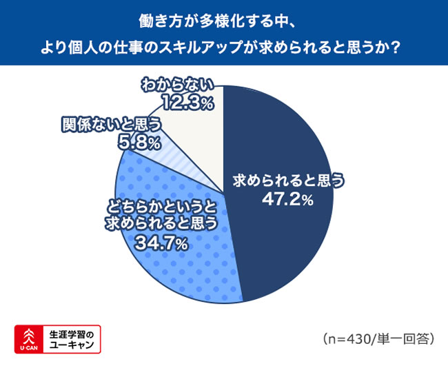 また、「働き方が多様化する中、より個人のスキルアップが求められると思いますか」という質問に対しては、47.2%の方が「求められると思う」と回答。「どちらかというと求められると思う」とした方と合わせると、8割以上の方が今後はよりスキルアップが求められると感じていることが分かりました。
