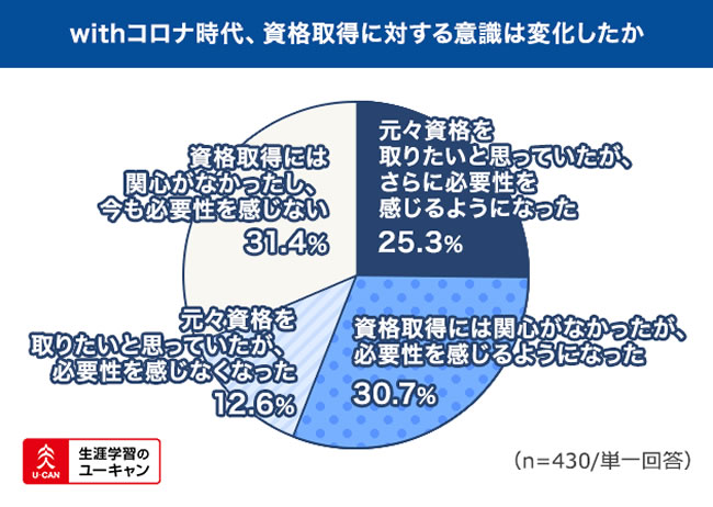 今まで以上に資格取得の必要性を感じるようになった人は計56.0%、コロナ禍を経て勉強を新たに始めた方は計30.9%
