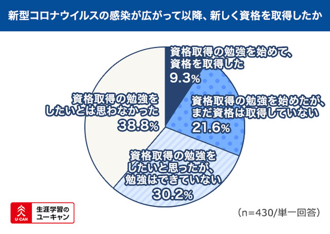 「新型コロナウイルスの感染が広がって以降、新しく資格を取得しましたか? あるいは、取得のための勉強を始めましたか?」という質問に対しては、勉強を新たに始めた方が計30.9%、勉強をしたいと思っている人を合わせると計61.1%という結果になりました。