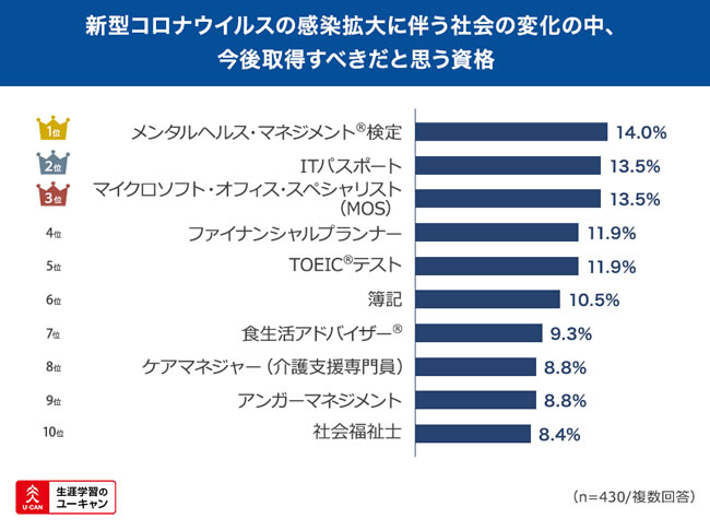 4位以降には、例年ユーキャンで実施している調査でも関心の高い「ファイナンシャルプランナー(FP)」「TOEIC(R)テスト」「簿記」などが登場。FPや簿記を選んだ方からは「コロナの影響で収入が大きく変わる可能性があり、お金の管理が重要になってくるから」(30歳・男性)など、不安定な状況でますます高まるお金への心配と感心がうかがえました。