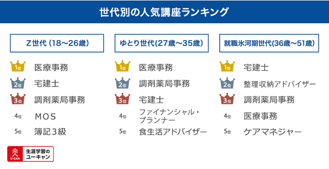 2021年1月〜2021年9月の人気講座を世代別(Z世代・ゆとり世代・就職氷河期世代)で見てみると、受講者数が大きく伸長している整理収納アドバイザーは、特に就職氷河期世代で人気を集めています。若い世代と比較して自身のキャリアが落ち着いてくる世代であるため、趣味やプライベートに活かす資格を取得しようとしていることが窺えます。