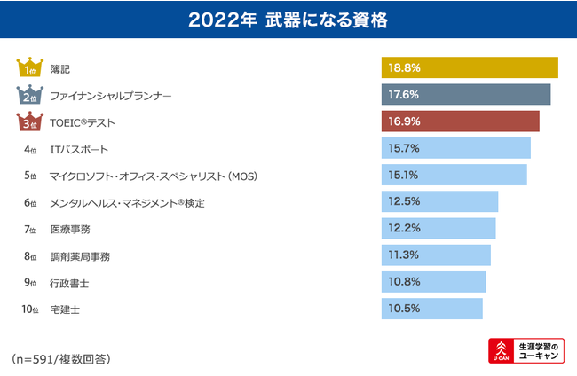 2022年に取っておくと「武器になりそうな資格」を質問したところ、 1位「簿記」(18.8%)、 2位「ファイナンシャルプランナー(FP)」(17.6%)、 3位「TOEIC(R)テスト」(16.9%)という結果になりました。 2021年までは3年連続で「TOEIC(R)テスト」が1位でしたが、 4年ぶりに他の資格が1位になりました。引き続き、グローバル化の中で英語は基本という考え方がありながらも、お金関連の資格の重要性が上がってきている様子が窺えます。