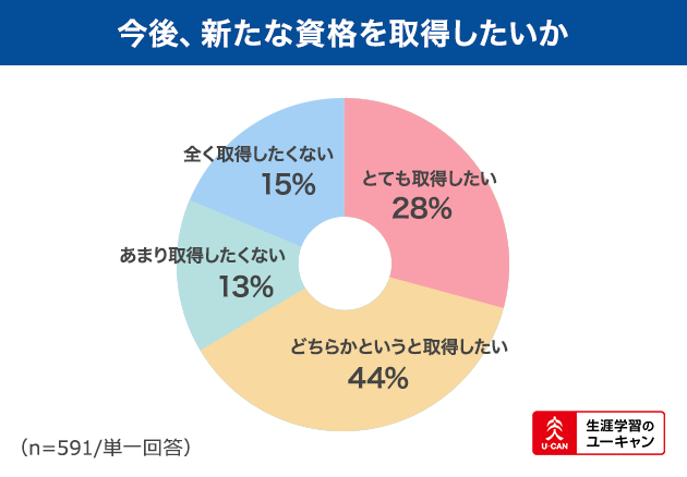 「今後新たな資格を取得したいか」と質問したところ、 28.1%が「とても取得したい」、 44.2%が「どちらかというと取得したい」と回答し、合わせて72.3%が資格取得への意欲があることがわかりました。 2021年は新型コロナウイルス感染が拡大し、 9月に全面解除されたものの、 2022年にかけて第6波も懸念されています。先が見えづらい不安な状態が続く時代だからこそ、資格取得やスキルアップへの関心は今後も続いていくことが予想されます。