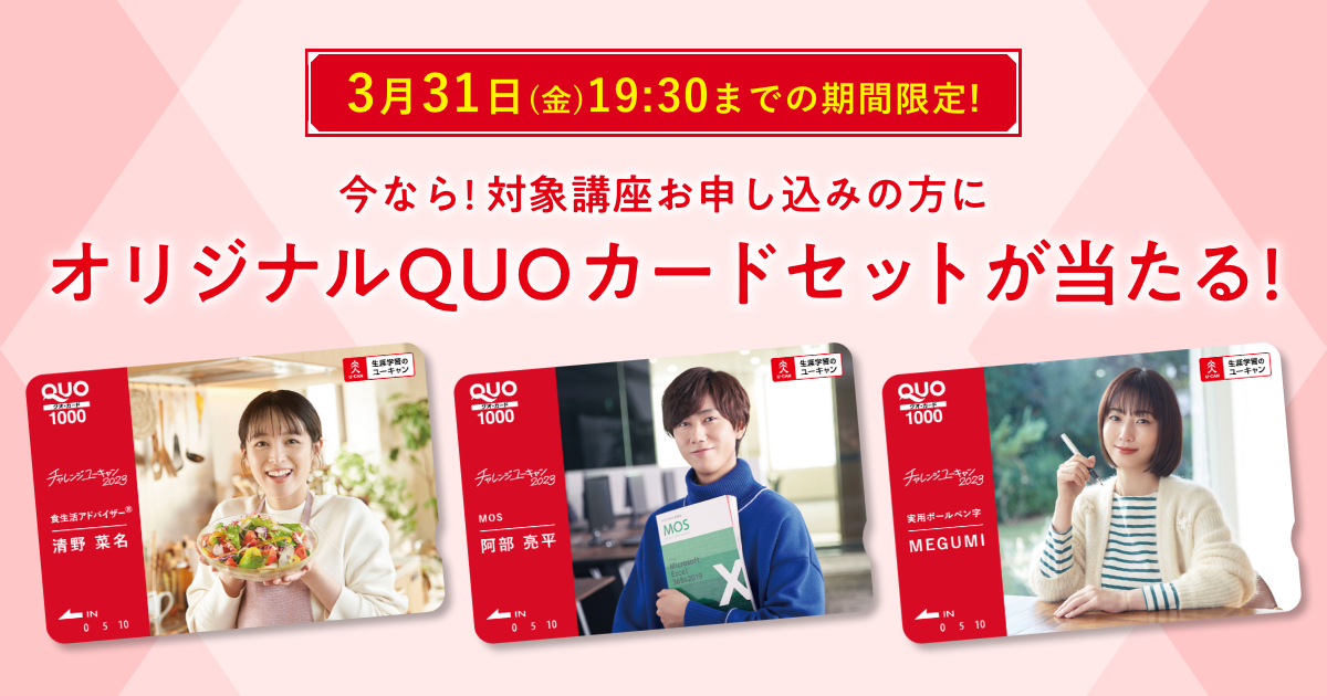 株式会社ユーキャンでは、2023年2月21日(火)より、抽選で100名様に3000円分のQUOカードセットが当たる『オリジナルQUOカードプレゼントキャンペーン』を開始しました。