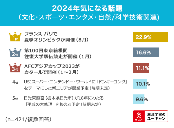 ■2024年、話題になりそうな出来事は「フランス パリで夏季オリンピックが開催」」「第100回東京箱根間往復大学駅伝競走が開催」(文化・スポーツ・エンタメ・自然/科学技術関連)