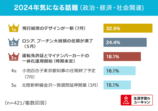 一方、政治・経済・社会関連では 1位「現行紙幣のデザインが一新」(32.5%) 、2位「ロシア、プーチン大統領の任期が満了」(24.4%)、3位「運転免許証とマイナンバーカードの一体化運用開始」(18.1%)という結果に。約20年ぶりに新紙幣が発行されることや、運転免許証とマイナンバーカードの一体化運用になるなど、政府の動きに注目されている方が多いようです。