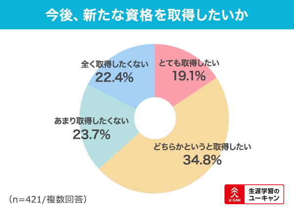 また、「今後、新たな資格を取得したいか」という問いに対しても、「とても取得したい」(19.1%)「どちらかというと取得したい」(34.8%)と合わせて53.9%の方が資格取得への意欲があることがわかりました。国内金融の不安や国際治安の悪化など、先が見えづらい不安な状態が続く時代だからこそ、資格取得やスキルアップへの関心は今後も続いていくことが予想されます。