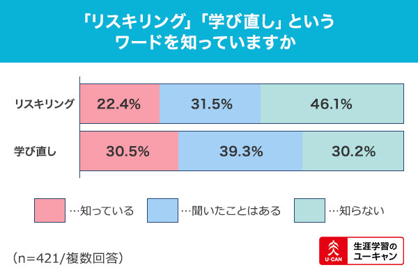 昨年の同調査では「リスキリング」は約2割の認知度、「学び直し」は約4割の認知度だったため、認知度は着実に広がりつつあると言えそうです。