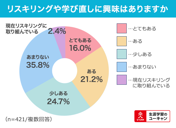 さらに、リスキリングという言葉を認知している方に対し、「リスキリングや学び直しに興味がありますか」と質問すると、「とてもある」と答えた人は16.0%、「ある」と答えた人は21.2%、「少しある」と答えた人は24.7%と、約6割の人がリスキリングや学び直しに関心があることがわかりました。
