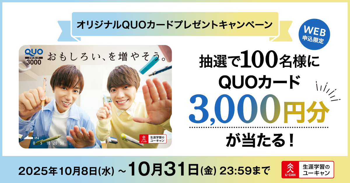 通信教育を手掛ける株式会社ユーキャン(東京都新宿区、代表取締役社長:品川 泰一)は、2025年10月8日(水)より、抽選で100名様に3,000円分のQUOカード(1枚)が当たる『オリジナルQUOカードプレゼントキャンペーン』を開始しました。