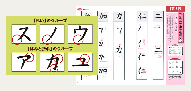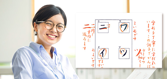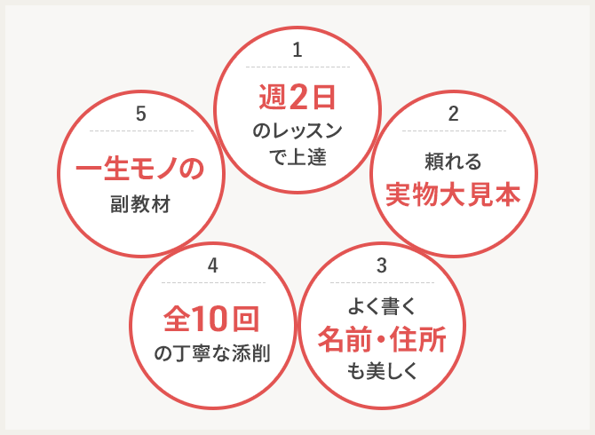 レッスンは週2回でOK!上達のカギとなるカタカナを最初の4日でマスター。漢字・ひらがなと順序良く練習していくことで、文章全体が整い、印象もグッと良くなります。