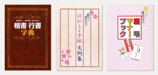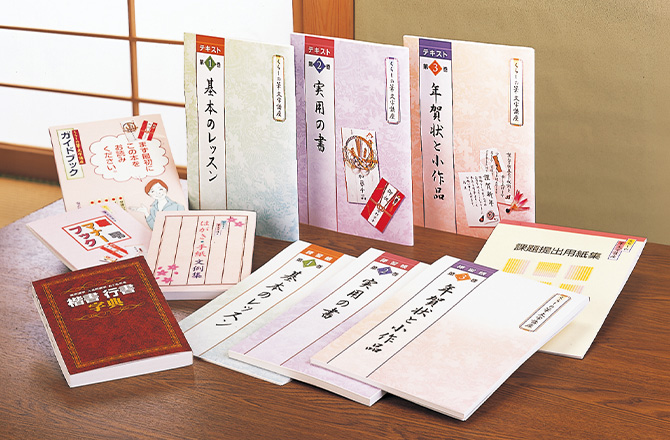 - 練習帳3冊、付録「楷書行書字典」、付録「はがき・手紙文例集」、付録「慶弔マナーブック」、ガイドブック他