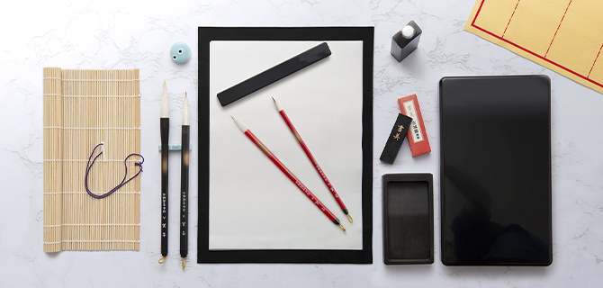 - 大筆(ダルマ軸)、太筆、中筆、小筆、マス目入り下敷き、硯、墨、文鎮、ミニ墨汁、筆置き、水差し、筆巻、硯箱、半紙(伊予和紙20枚)、下敷き