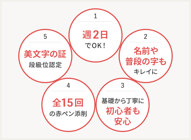 レッスンは週2日、12ヵ月で修了するスケジュールですが、これはあくまで目安です。最長24ヵ月まで添削指導や質問サービスなど、すべてのサポートをご利用いただけます。お忙しい方も自分のペースで取り組めて、教室のように周りが気にならないことも、通信講座のうれしいポイントです。「書」を身近に感じられる充実の毎日を日常に。