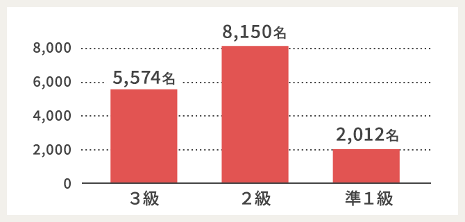 直近の試験での各級合計受験者数は約1万6千人!文部科学省後援の資格で、いつの時代も安定した人気を誇っています。