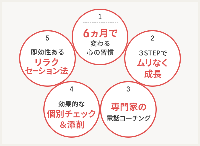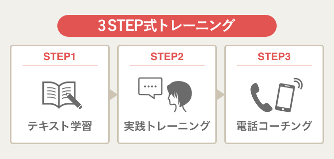 (1)テキスト学習→(2)実践トレーニング→(3)電話コーチングの3STEP式。テキストで読んだことを実際にやってみて、その成果を電話コーチングで振り返る。これを5つのテーマで繰り返すことで、着実にステップアップ!