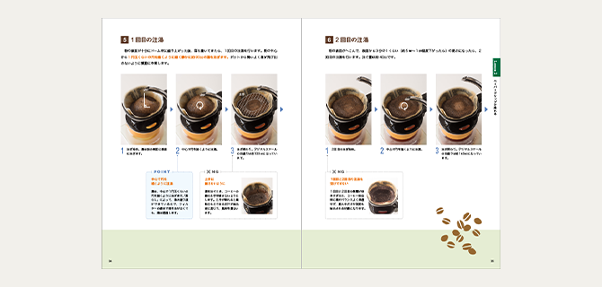 読みやすいオールカラーのメインテキストは、写真とイラストがふんだんに使われ、抽出の手順やコツ、豆の特徴や保存法などが分かりやすく構成されています。