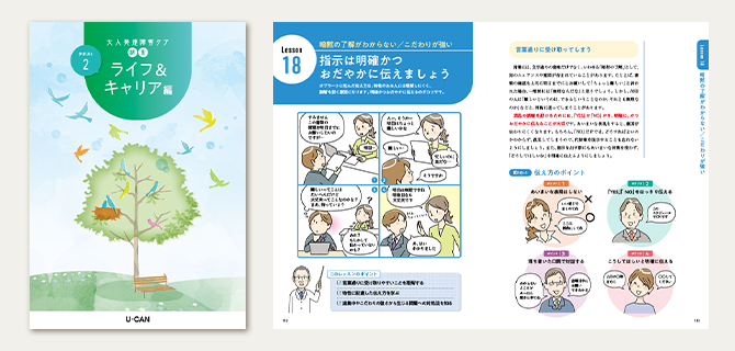 メインテキスト2「ライフ&キャリア編」では、家庭や職場で生じやすい困りごとの対処法を実践的に理解!各レッスンの導入にはマンガもあり、具体的な場面がイメージしやすい!
