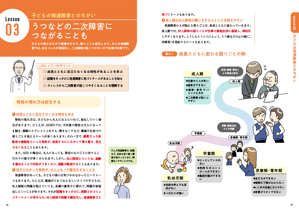 発達障害の専門家 本田先生監修によるテキストには、実生活や職場で役立つ内容をぎゅっと凝縮!専門用語もわかりやすい言葉で丁寧に解説し、ポイントごとにイラストの本田先生が語りかけるようにナビゲート。スムーズに読み進められて、ムリなく理解が深まります。