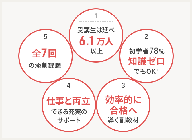 テキストだけでなく、合格に的を絞った副教材や添削課題、安心のサポート体制まで充実。スマホでスキマ時間を有効活用しながら学習できるので、お忙しい方も安心です!