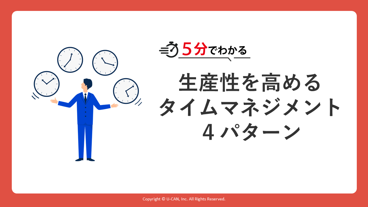 タイムマネジメントは社員の業務遂行を効率化し、組織としての生産性を高める大切なスキルです。タイムマネジメント研修を行うことで、社員が優先順位づけを意識するようになり、緊急性や重要度に応じて適切なリソースを分配できるようになります。また個人の優先順位だけでなく、チームや組織における優先順位づけにも意識が向くようになり、組織に貢献する行動にもつながります。タイムマネジメントスキルで自社の生産性と競争力を高めたいとお考えなら、ユーキャンにおまかせください。