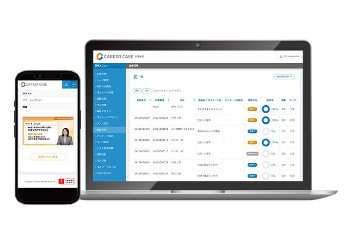 WEB上で受講者の「受講状況」「受講進捗」「規定課題/テスト受講日」「得点」などをいつでも確認可能です。