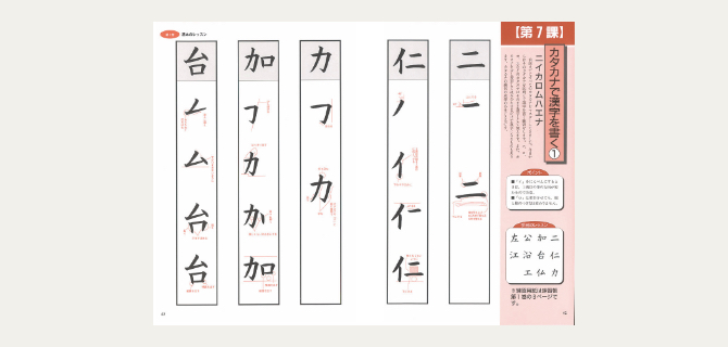 テキスト1「基本のレッスン」で、カタカナのレッスンからスタート!漢字の一部に使われるカタカナを「払い」「はねと折れ」などのグループに分けて練習することで、基本的な筆づかいを習得。同時に漢字を美しく書くコツも身につくのでムダがありません。