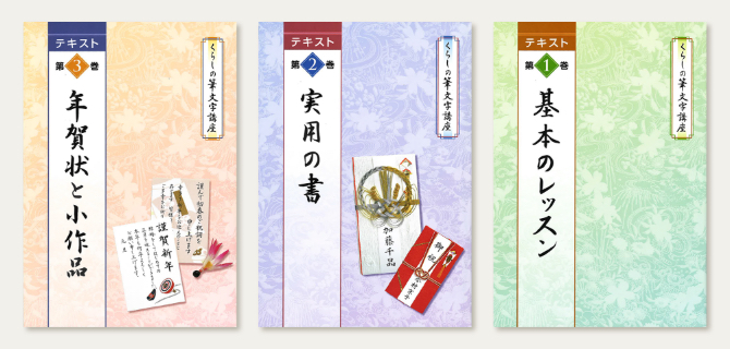 テキストは全3冊。第1巻の「筆文字の基本」では、筆のお手入れ方法や持ち方、姿勢など基本からわかりやすく解説。「筆を持つのは初めて」という方でも、スムーズにレッスンに入れます。