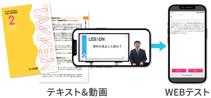 当講座では、テキストや動画講義をスマホやパソコン、タブレットから受講可能な「合格デジタルサポート」対応講座!WEBテストを通した弱点対策や、合格に不可欠な効率良い学習の土台となるスケジュール・課題管理まで、充実の機能が満載です。外出先や移動などのスキマ時間を学習に活かせることで、効率良く合格力アップ!短期合格が目指せます。
